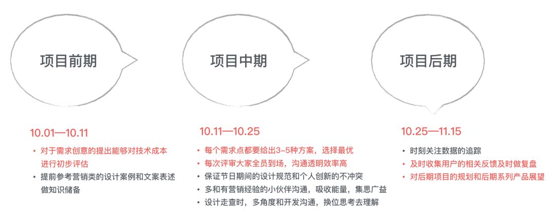 此项目从开始到结束,项目周期为 45 个工作日,从产品提出想法,到最终开发落地,测试推广上线,时间非常紧迫,但是在有限的时间内,大家还是非常用心的完成了全部工作,尽管效果不错,但是其中也有些现在看来可以做的更好的地方,首先针对项目的时间给出一些自己的建议:
