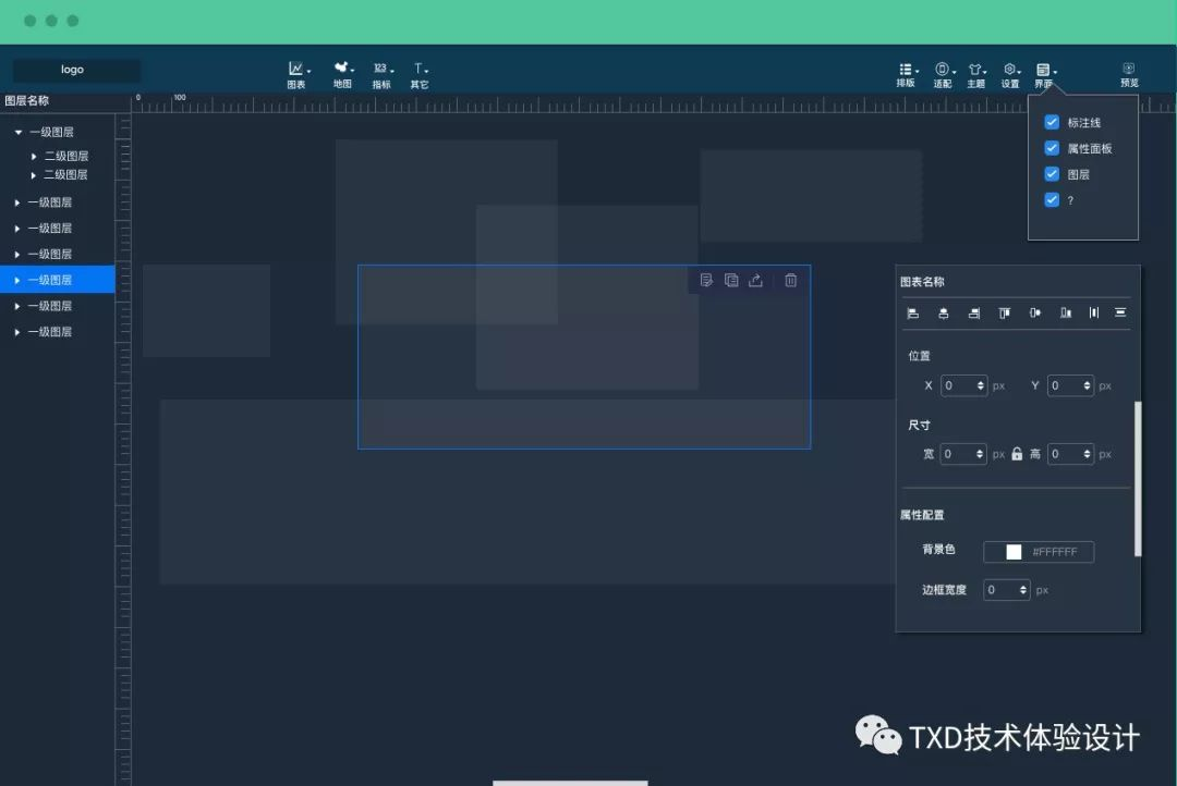 上图是一款“线上Dashboard设计工具”的交互demo,采用了“浮动属性面板”、“可收起层级面板”等交互方式,下面我们将一起来探讨它有哪些地方可以借鉴以及如何能让其变得更好。