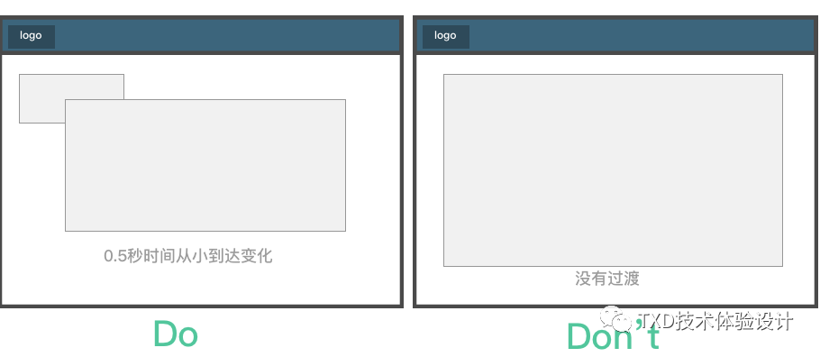 元素突然的变化并不符合现实中的自然规律,给人一种突兀的感觉,何不考虑使用一些自然的动画来让过渡更加流畅、自然呢?淡入淡出、图形位置移动,窗口放大缩小等都是不错的手法。但要注意的是,动画的时间不要太长,也不要有太多复杂的动画。