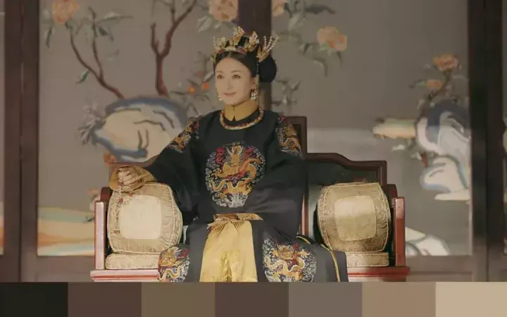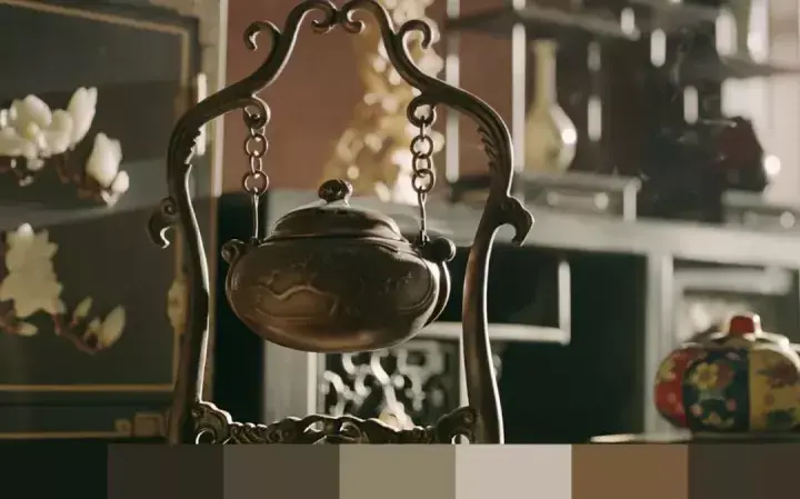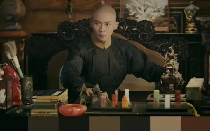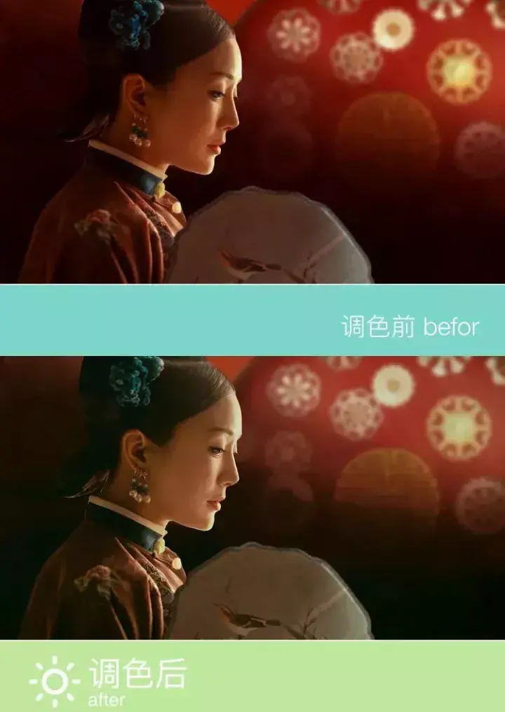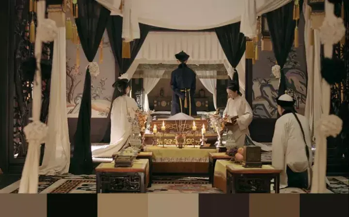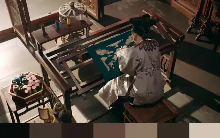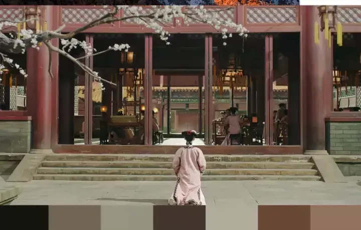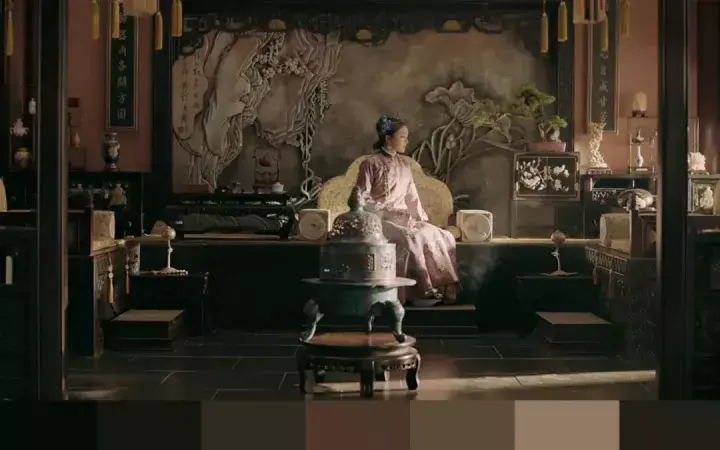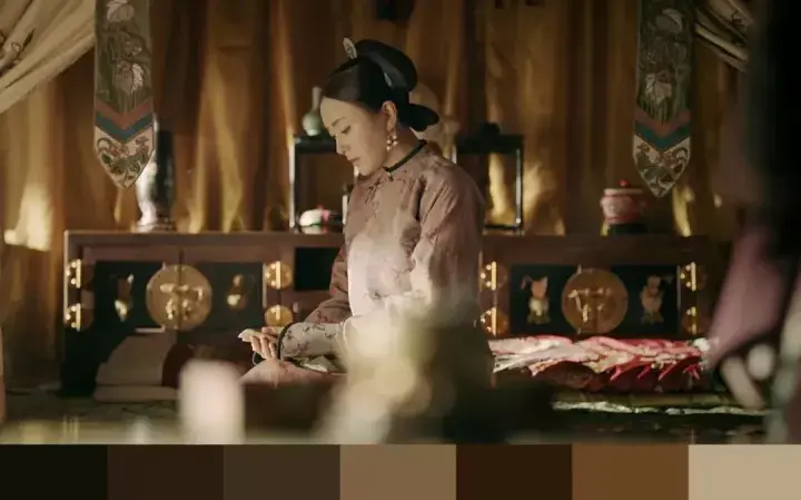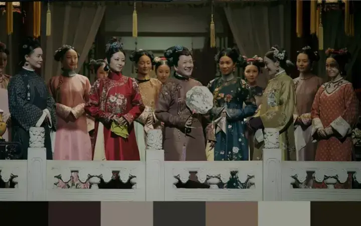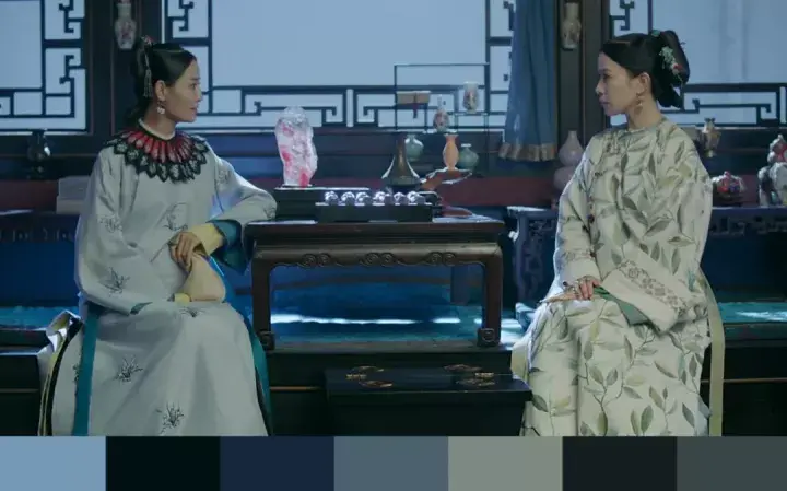 不仅仅是对于服装,包括剧中人物妆容色彩,首饰部分的点翠的色泽,绒花,玉器,瓷器,金、银、铜器的光泽质感,瓦砾梁柱,宫墙,漆器等调色都要在保证原有固有色的基础上根据整体色调进行整合调整,使每种色彩都更加发挥出有中国传统色彩的深沉柔和感,更好的服务于画面与故事剧情。