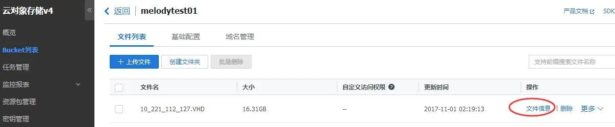 - 关于镜像文件URL:选择存储镜像的bucket,找到镜像文件,然后点击【文件信息】,在弹出来的框里面,把【源文件链接】的信息复制出来,就是镜像文件URL了