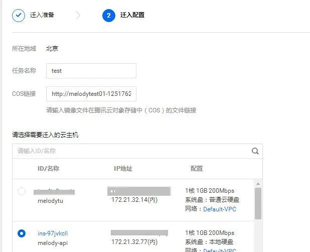 - 选择需要迁入的云主机。正如我上面提到的,使用服务迁移的功能进行迁移,是需要预先创建一台CVM,然后将导入的镜像置换此台CVM的系统盘,从而完成迁移。