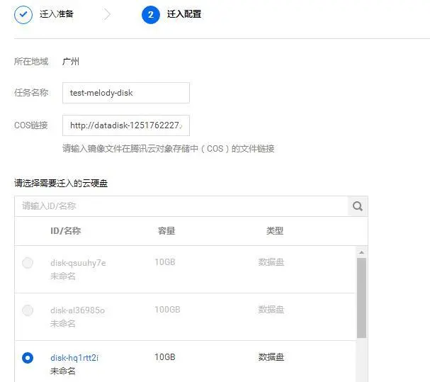 - 选择需要迁入的云硬盘。正如我上面提到的,使用服务迁移的功能进行迁移,是需要预先创建一个CBS云盘,然后将导入的数据盘镜像置换该云盘,从而完成迁移。