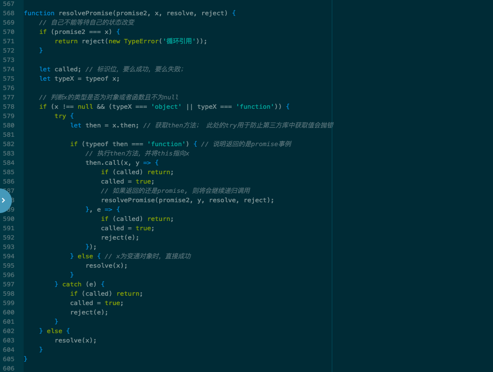 let then = x.then; // 获取then方法; 此处的try用于防止第三方库中获取值会抛错