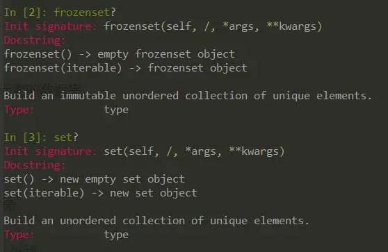 集合是不包含重复元素的数据集,frozenset是不可变的,set是可变的,可以使用字面量构建一个集合{1,2,2,4,5}会输出{1,2,4,5}