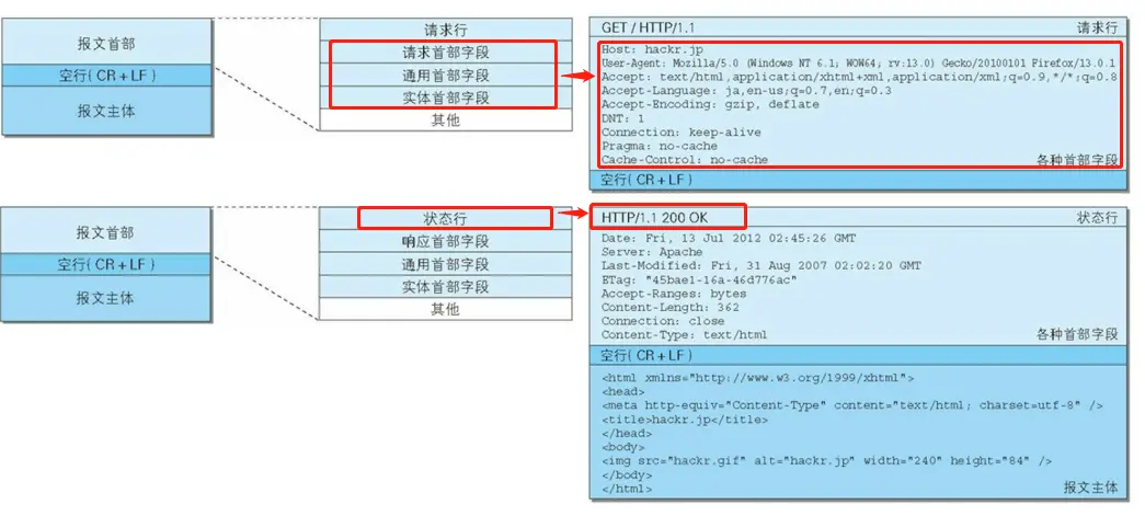用于HTTP协议交互的信息被称为HTTP报文。请求端的叫请求报文,服务端的叫响应报文。是由多行(CR+LF作为换行符)数据构成的字符串文本。