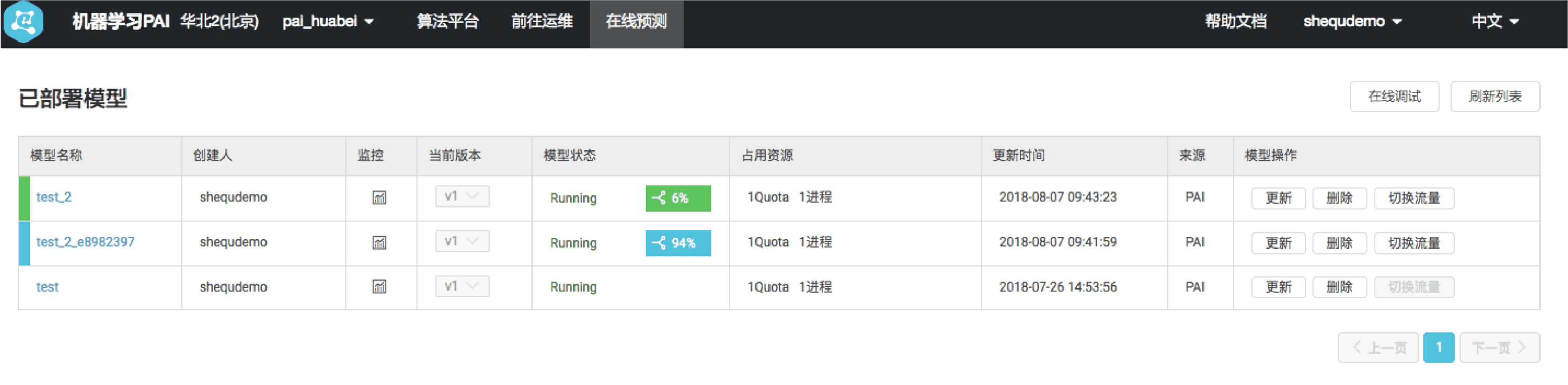 部署完成后会自动跳转到在线服务管控平台,在这里可以进行全部的模型管理相关工作。