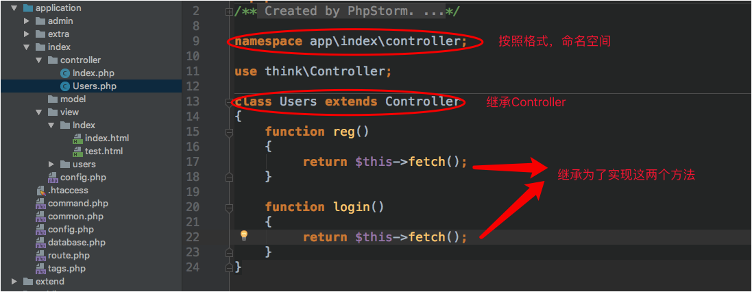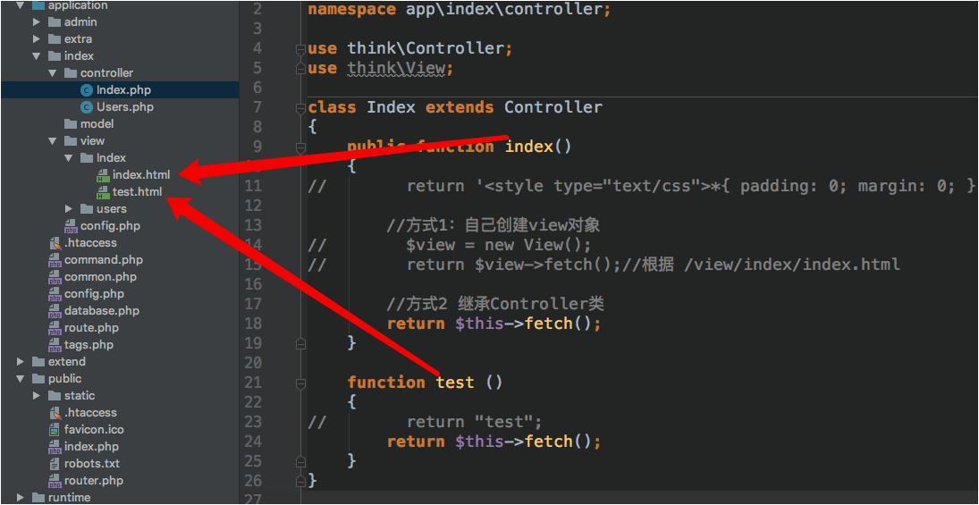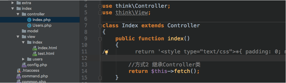 - 方式2:继承Controller 直接使用$this->fetch();操作