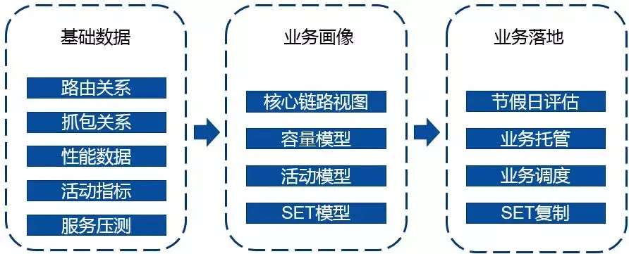 通过分析模块性能数据(CPU,内存,IO等)、路由关系(上下游访问关系)、抓包关系(更底层的访问关系)、活动指标(节假日和压测演习带来的下游模块增长)得出业务画像。