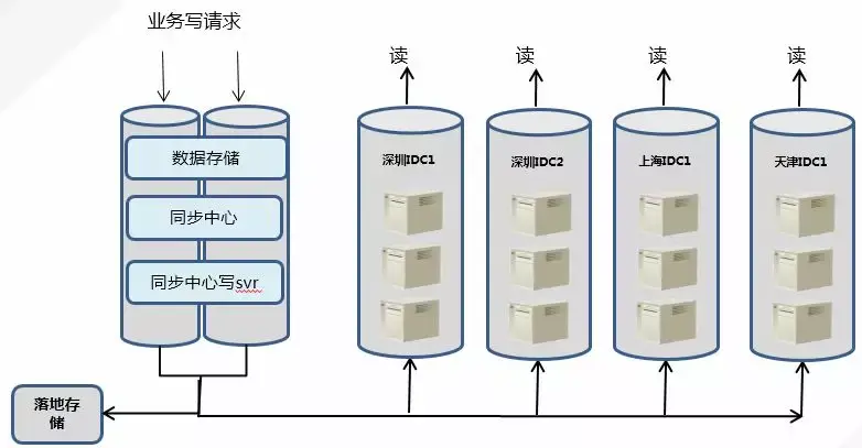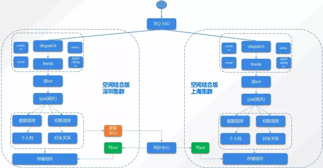 下图是空间基于SET画像的业务架构示例:用户通过手Q接入,在空间上层接入获取用户的读写操作,将读请求路由到本地,写请求路由到深圳SET。底层数据通过同步中心通过到异地。进而实现了空间的多地分布。