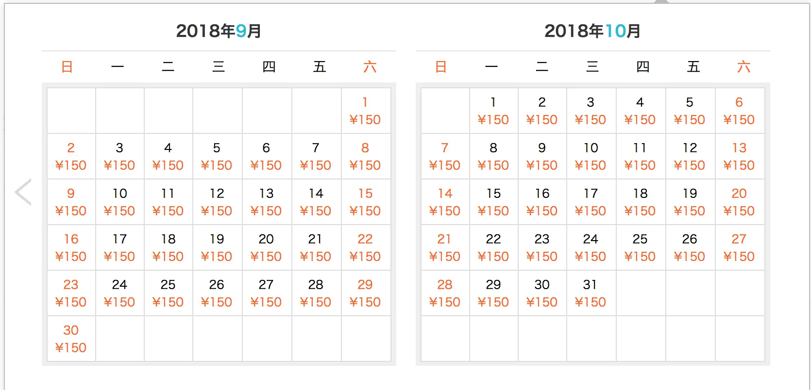 需求:我们经常会在一些旅游、订票、酒店的页面中看到一些日历,这些日历有公历、农历、节假日、非节假日(调休)的标注,同时还有产品业务上的信息,比如 票价、余票等等。那现在开始造造轮子了,首先这个组件应该可以生成一个基本的日历,并且挂入一些扩展的信息在每一天的对象上。它可能看上去应该像这样⤵,或者更复杂。