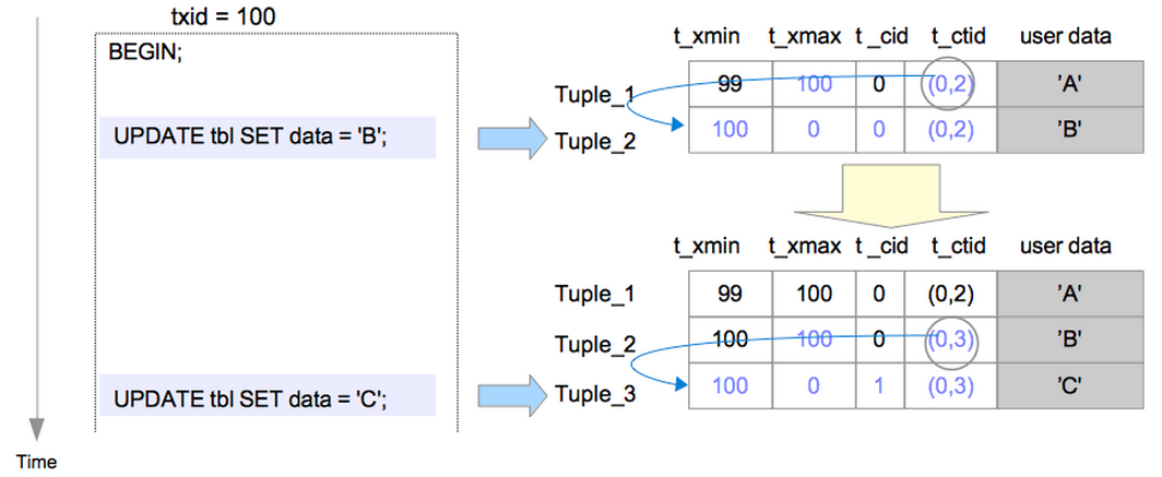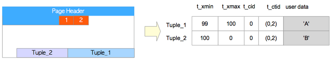 当txid为100的事务被提交时,Tuple_1和Tuple_2就成了“dead tuple”,反之,如果该事务被abort,则Tuple_2和Tuple_3就成了“dead tuple”。