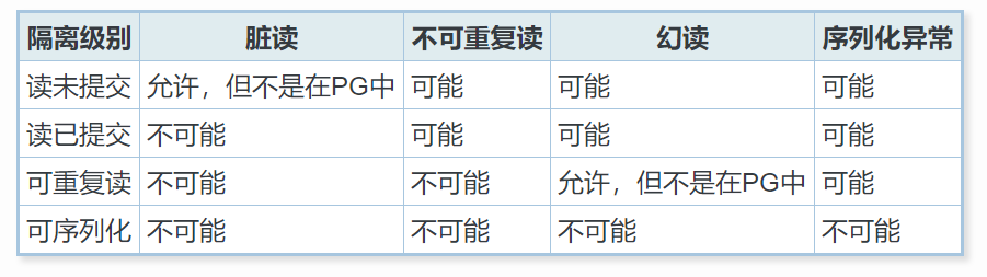 这里,我们先用一个表格展示PostgreSQL中的事务等级,在看到后面章节时可以翻回来看看。