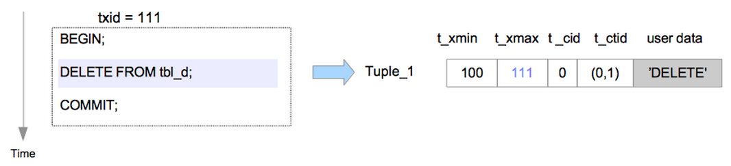 我们可以看到,Tuple_1元组的t_xmax字段被修改了,被改成了111,即删除Tuple_1的事务的txid。