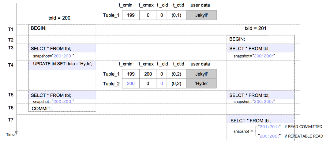 在T7时刻,只有txid = 201的事务还在运行,txid = 200的事务已经提交。现在我们分两种情况来讨论txid = 201的事务的行为。