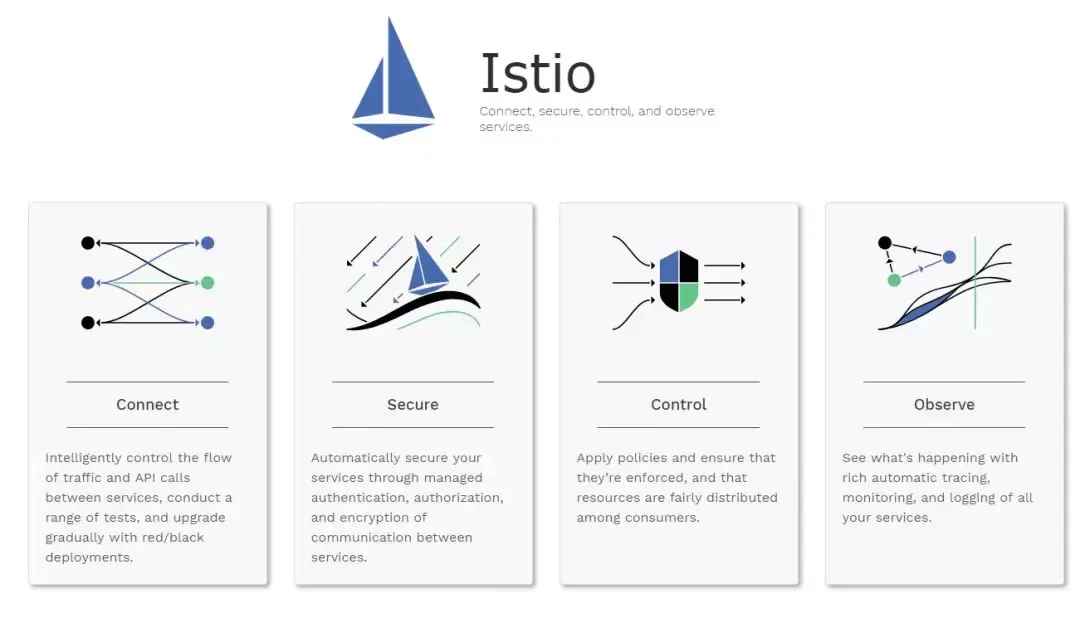 - Istio 是 Google 继 Kubernetes 之后的又一开源力作,主要参与的公司包括 Google,IBM,Lyft 等,它提供了完整的非侵入式的微服务治理解决方案,解决微服务的管理、网络连接以及安全管理等应用网络治理问题