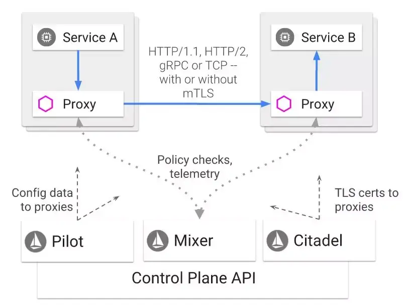 通常 kubernetes,mesos 等容器管理平台已经提供了服务注册表,以跟踪服务的负载实例,所以 Pilot 能轻而易举地获知服务网格内的所有服务注册信息,并将这些信息告知所有服务里的 Proxy,Proxy 根据这些信息执行服务发现,并相应地动态更新其负载均衡池。一个服务通常有多个负载实例,Service A 请求 ServiceB 时,可以配置不同的负载均衡模式:轮询、随机和带权重的最少请求。假设此时Service B的某个负载实例出现故障,因为 Service A 中的 Proxy 会定期地执行服务发现,从而能及时将故障实例从其负载均衡池里排出。