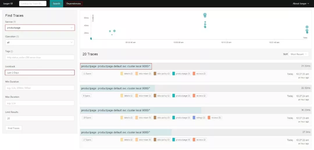 稍等片刻后,我们使用脚本 curl productpage 10次。再次在jaeger UI上选择productpage选择过去一小时,点击Find Trace,会发现这次只检测到4个trace。我们在用相同的脚本再运行一次,发现检测到10个trace。至此我们一共curl product page 20次总共获得10次 trace,符合总次数的50%。