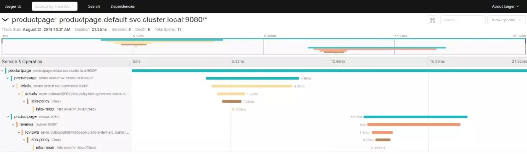 现在我们用相同的方法,将 PILOT_TRACE_SAMPLING 改为100%并且稍等片刻。使用相同的脚本 curl 10次 product page,再点击 Find trace,现在总共有20个 Trace,也就是先前的10个 trace 加上后来 curl 的10次,证明 PILOT_TRACE_SAMPLING修改完毕会采集所有的请求。