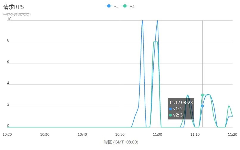在组件详情界面中除去 CPU 使用率,内存使用这种基本的监控外,华为云提供了另外两项简明流量监控,分别是 RPS (平均处理请求次数)和 RT(平均响应时延)。RPS 以分钟基本时间单位,纵轴则以处理请求次数为单位,用户可以直观的看到自己的应用单位时间内需要处理的请求数量。若 RPS 过高,则用户可以适当的采用相应措施,报障请求的高效处理。