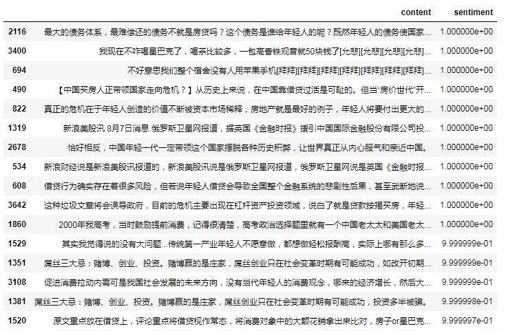 先来看看正面的评价,评分处于0-1之间,越接近1越正面: