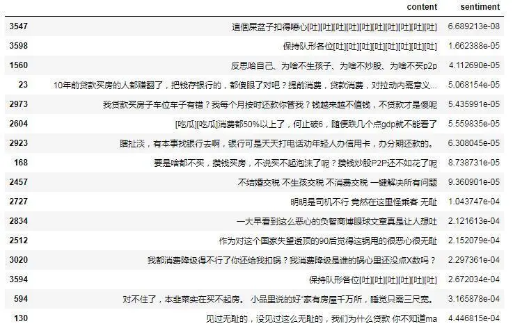 读取数据,并提前安装好这个NLP的库:pip install snownlp 。其他用法参见:snownlp - github ,本文只对每条评论数据进行情感打分。