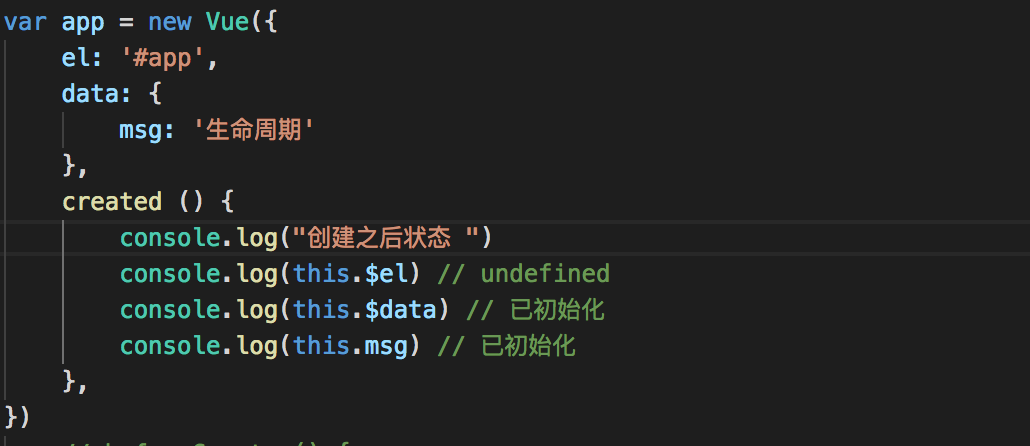 created的时候数据已经和data属性进行绑定(放在data中的属性当值发生改变的同时,视图也会改变)但此时的el还是undefined