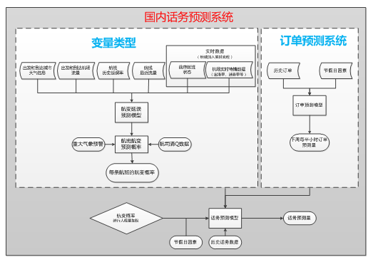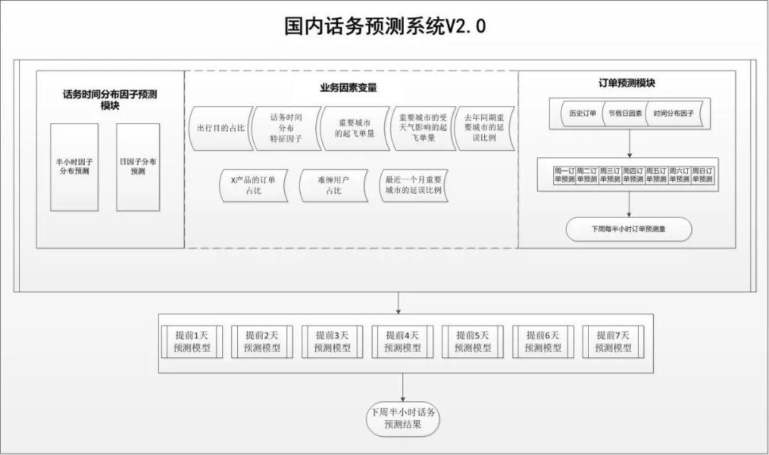 在上面的篇幅中,我们已经研究的Y的运行规律,接下来我们需要考虑的是X,而X因素的构建很是依赖于业务经验,针对携程机票的商业属性,我们知道机票订单是影响来电量的一个很重要的因素。同时,在上面的篇幅中,我们也提到过极端天气状况是导致话量暴增的直接因素。另外,旅游淡旺季以及节假日这些时间特性也是直接导致话务呈现周期趋势的主要原因。因此,在已有的航变预测系统基础上,我们构建了话务预测V1.0系统: