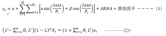 基于工程部署上面简单、高效、快捷的需求,结合对模型预测准确率的考量,在V1.0系统的实现中,我们融合了外生变量、傅里叶项和ARM模型,也即广义上的ARIMAX模型: