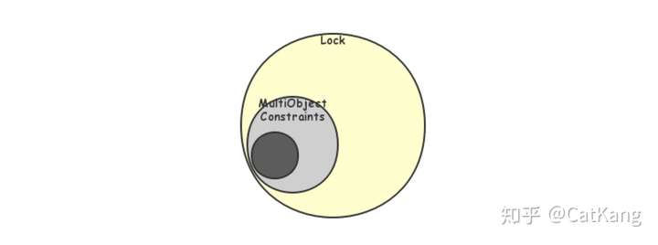 回忆Critique of ANSI中指出的ANSI标准问题,包括Dirty Write和歧义,其实都是由于多Object之间有相互约束关系导致的,如下图所示,图中黑色部分表示的是ANSI中针对某一个异象描述的异常情况,灰色部分由于多Object约束导致的异常部分,但这部分在传统的异象定义方式中并不能描述,因此其只能退而求其次,扩大限制的范围到黄色部分,从而限制了正常的情况。