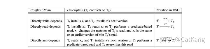 Adya在Weak Consistency: A Generalized Theory and Optimistic Implementations for Distributed Transactions中给出了基于序列化图得定义,思路为先定义冲突关系;并以冲突关系为有向边形成序列化图;再以图中的环类型定义不同的异象;最后通过阻止不同的异象来定义隔离级别。
