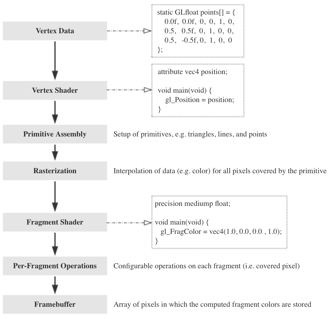 OpenGL ES 2.0的渲染流程如图所示,其中需要我们控制的为Vertex Data,Vertex Shader和Fragment Shader这三步。Vertex Data就是我们传入的顶点绘制数据,这里的顶点可以是表征点,线或者三角形的数据。Vertex Shader和Fragment Shader这两步是可编程的,也就是我们在下面将要见到的.glsl文件。Vertex Shader负责处理每一个点的顶点数据,而Fragment Shader则是针对像素数据的,其负责处理每个像素数据。