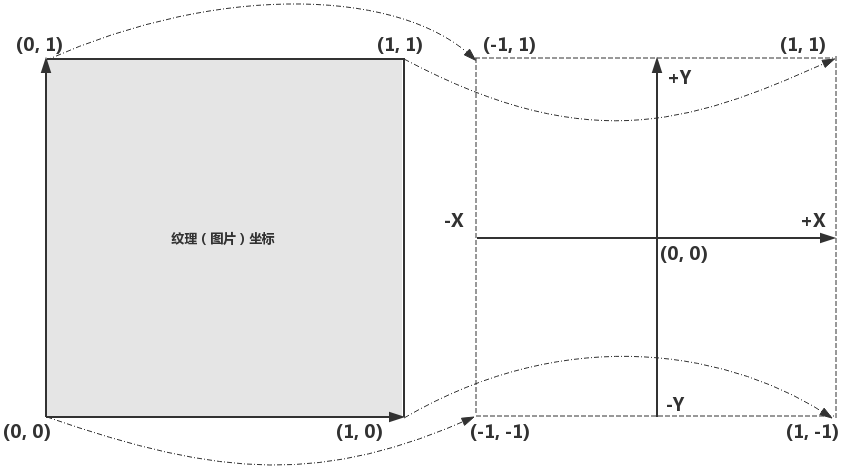 首先我们来看下OpenGL的坐标系,如下图所示,以屏幕中心原点,坐标范围为-1到1之间。而我们平常接触的UIKit的坐标则是以屏幕左上角为原点,坐标范围则为屏幕宽高。