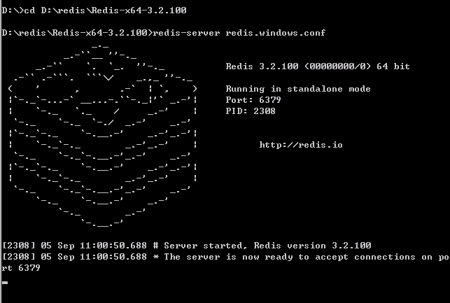 redis-server redis.windows.conf ,出现下图显示表示启动成功了。