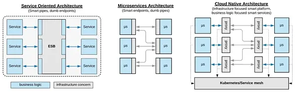 与 ESB 的不同之处在于,与服务网格不同的是,只有一个集中路由层,每个微服务通常都有自己的路由器—— 一个带有附加中央管理层的代理逻辑的 sidecar 容器。 更重要的是,管道(平台和服务网格)没有任何业务逻辑;它们完全专注于基础架构方面,使服务专注于业务逻辑。 如图所示,这代表了 ESB 和微服务学习的演变,以适应云环境的动态和不可靠特性。