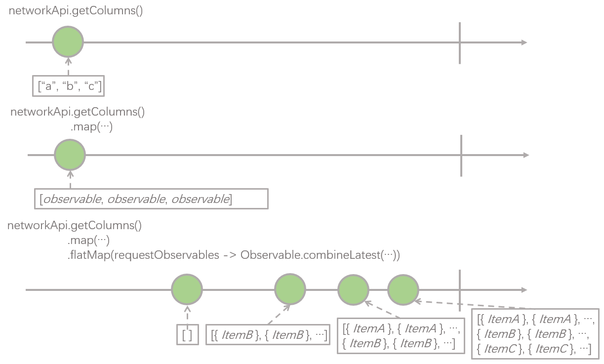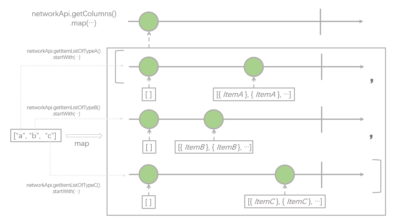 这个操作,在业务上的含义是,根据上一步取回的栏目列表,即 ["a", "b", "c"],根据不同的数据类型,分别发起请求去获取对应栏目的数据列表,例如栏目类型是 a 的话,就对应发起 networkApi.getItemListOfTypeA() 请求。这里有一点值得注意,就是每一个具体的请求后面都跟了一个 .startWith(new ArrayList<>()),也就是说每个具体请求栏目内容的 Observable 在返回真正的数据 List 之前都会返回一个空的 List ,这里这么处理的原因我们会在下一步中解释。