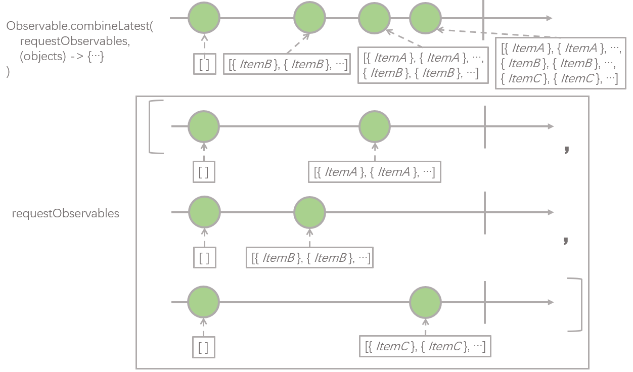 在上面代码里出现的所有操作符中,最核心的一个操作符就是 combineLatest 操作符,仔细比较 RxJava 版本和 Callback 版本就可以发现,combineLatest 操作符的功能其实和 Callback 版本里的 onOk 方法前半部分, resultTypes, responseList 合在一起功能是相当的,一方面负责收集多个接口返回的数据,另一方面保证收集回来的数据的顺序是和上一个接口返回的应该展示的数据的顺序是一致的。