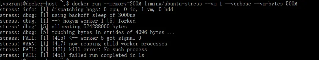 docker run --memory=200M liming/unbuntu-stress --vm 1 --verbose --vm-bytes 500M