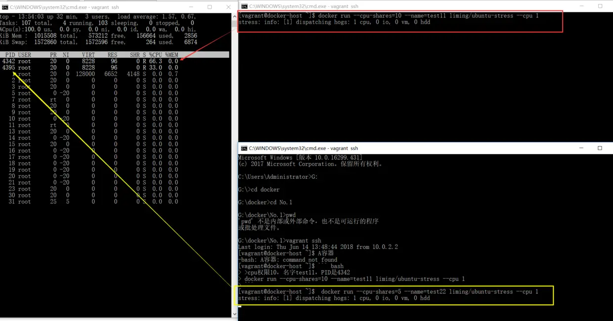 发现是不是容器A占用了66.6%,B占用了33.3%,这就是CPU权重的重要性