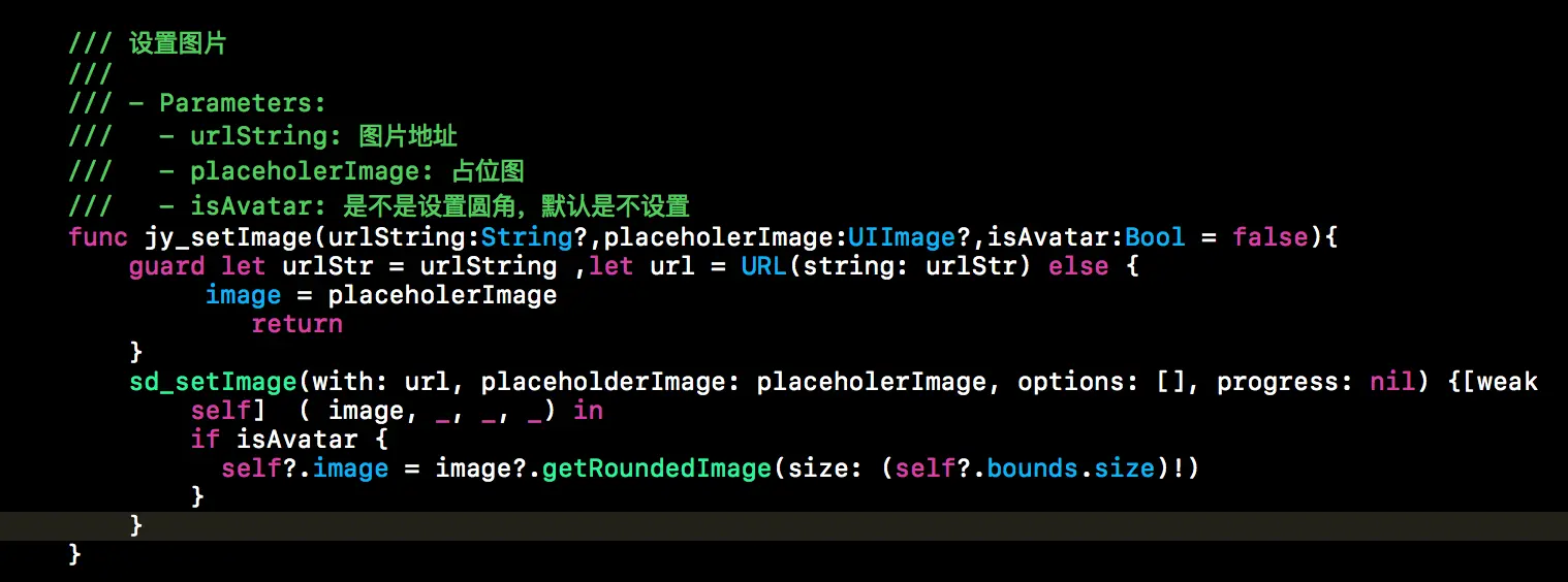 func jy_setImage(urlString:String?,placeholerImage:UIImage?,isAvatar:Bool = false){ guard let urlStr = urlString ,let url = URL(string: urlStr) else { image = placeholerImage return } sd_setImage(with: url, placeholderImage: placeholerImage, options: [], progress: nil) {[weak self] ( image, _, _, _) in if isAvatar { self?.image = image?.getRoundedImage(size: (self?.bounds.size)!) } } } -