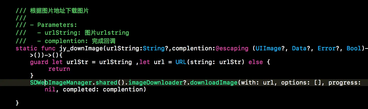 static func jy_downImage(urlString:String?,complention:@escaping (UIImage?, Data?, Error?, Bool)->())->(){ guard let urlStr = urlString ,let url = URL(string: urlStr) else { return } SDWebImageManager.shared().imageDownloader?.downloadImage(with: url, options: [], progress: nil, completed: complention) }