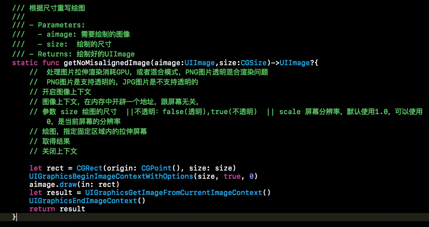let rect = CGRect(origin: CGPoint(), size: size) UIGraphicsBeginImageContextWithOptions(size, true, 0) aimage.draw(in: rect) let result = UIGraphicsGetImageFromCurrentImageContext() UIGraphicsEndImageContext() return result -