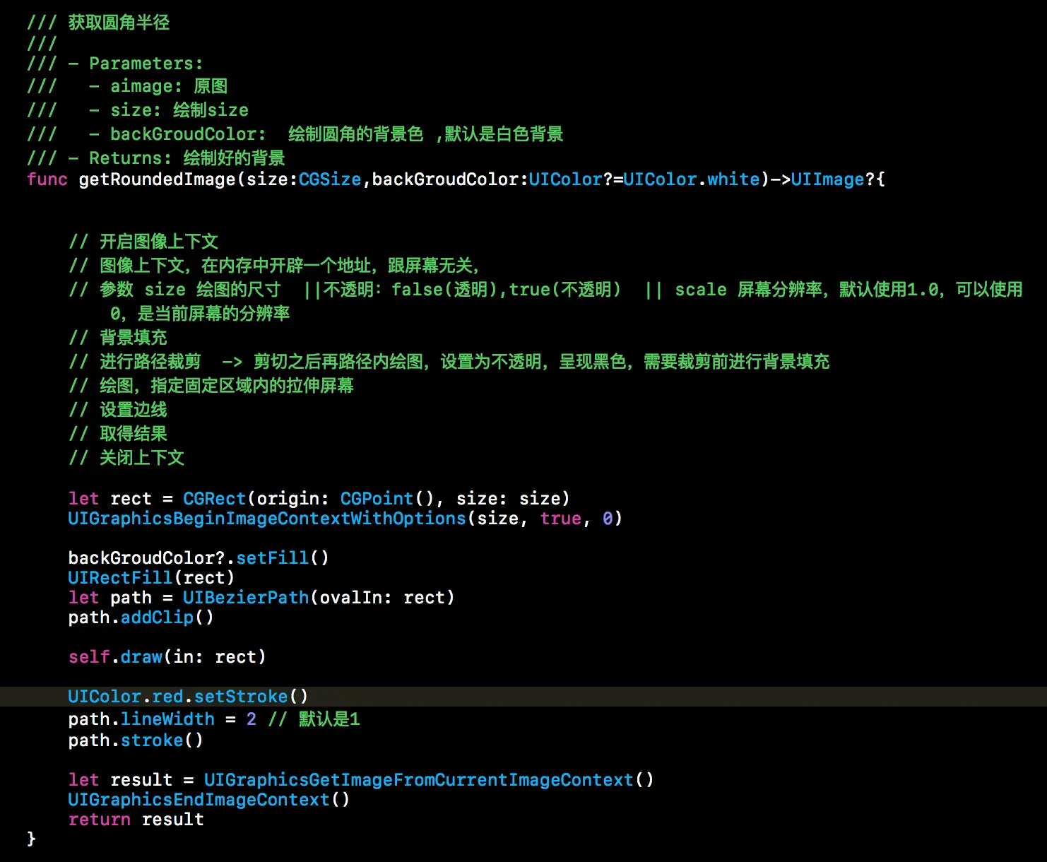 let rect = CGRect(origin: CGPoint(), size: size) UIGraphicsBeginImageContextWithOptions(size, true, 0) backGroudColor?.setFill() UIRectFill(rect) let path = UIBezierPath(ovalIn: rect) path.addClip() self.draw(in: rect) UIColor.red.setStroke() path.lineWidth = 2 // 默认是1 path.stroke() let result = UIGraphicsGetImageFromCurrentImageContext() UIGraphicsEndImageContext() return result