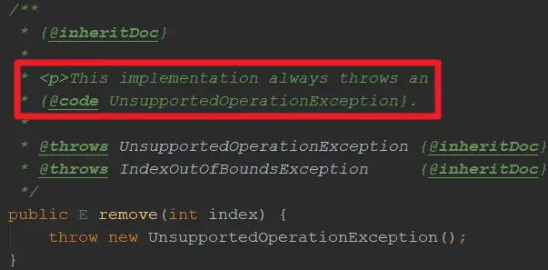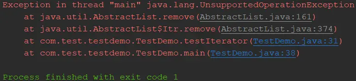 在 AbstractList<> 的源码中发现 remove()方法是抛 UnsupportedOperationException 异常的: