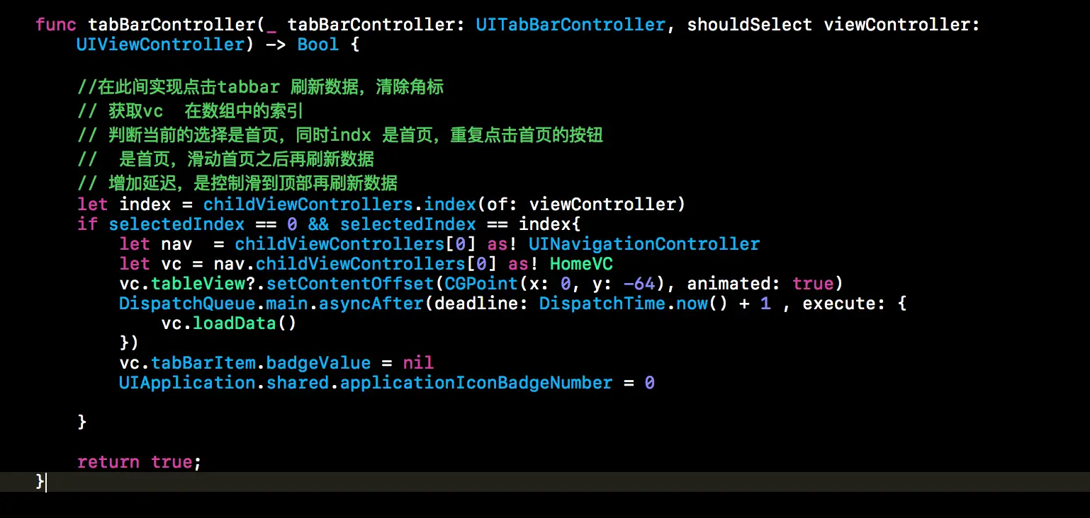 let index = childViewControllers.index(of: viewController) if selectedIndex == 0 && selectedIndex == index{ let nav = childViewControllers[0] as! UINavigationController let vc = nav.childViewControllers[0] as! HomeVC vc.tableView?.setContentOffset(CGPoint(x: 0, y: -64), animated: true) DispatchQueue.main.asyncAfter(deadline: DispatchTime.now() + 1 , execute: { vc.loadData() }) vc.tabBarItem.badgeValue = nil UIApplication.shared.applicationIconBadgeNumber = 0 }