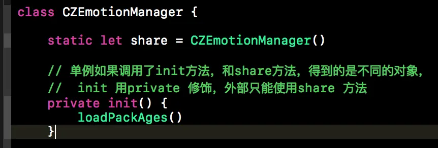 static let share = CZEmotionManager() private init() { loadPackAges() }