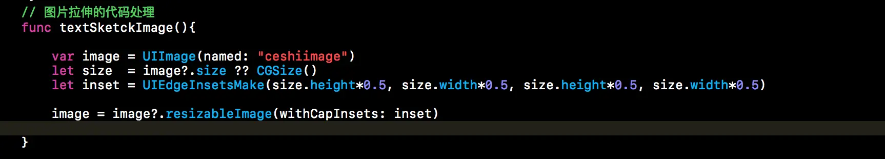 var image = UIImage(named: "ceshiimage") let size = image?.size ?? CGSize() let inset = UIEdgeInsetsMake(size.height*0.5, size.width*0.5, size.height*0.5, size.width*0.5) image = image?.resizableImage(withCapInsets: inset)