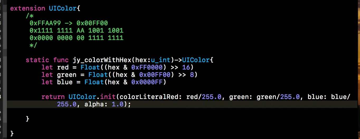 static func jy_colorWithHex(hex:u_int)->UIColor{ let red = Float((hex & 0xFF0000) >> 16) let green = Float((hex & 0x00FF00) >> 8) let blue = Float(hex & 0x0000FF) return UIColor.init(colorLiteralRed: red/255.0, green: green/255.0, blue: blue/255.0, alpha: 1.0); }