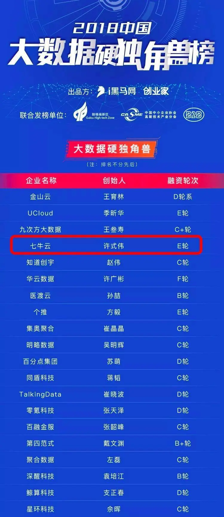 9 月 1 日,由南京市鼓楼区人民政府主办、鼓楼高新区管委会、鼓楼区发改局(经信局)、创业黑马、i 黑马旗下企业服务垂直媒体 B2B 圈联合承办的「中国独角兽(秋季)峰会」在南京隆重举行。会上重磅发布的「2018 中国大数据硬(准)独角兽榜」中,七牛云凭借其在大数据领域内取得的卓越成绩,在百余家企业中脱颖而出,荣登「2018 大数据硬独角兽企业」 TOP 20。