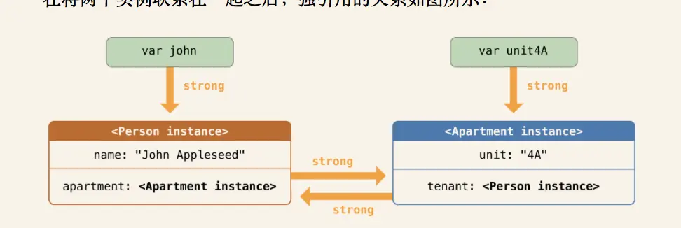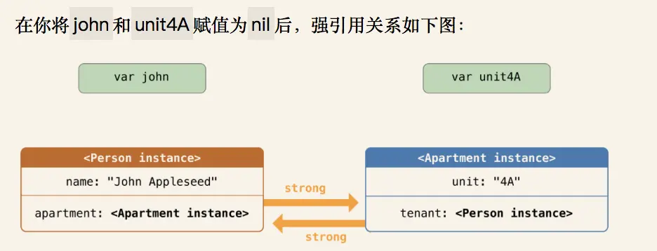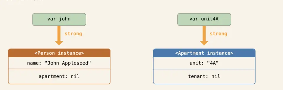 - Person和Apartment的例子展示了两个属性的值都允许为nil,并会潜在的产生循环强引用。这种场景最适合用弱引用来解决。